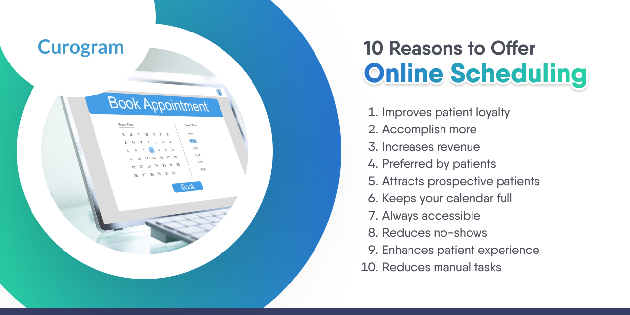 Curogram offers a HIPAA-compliant online appointment scheduling system, which helps practices implement technology to devote more time to providing quality patient care. Nowadays, online medical appointment scheduling software is pivotal for a profitable and patient-friendly practice. The benefits of such a solution are obvious and enormous. While the clinical providers and office staff can focus on other tasks that matter, patient experience will increase when provided with excellent service and great quality of care.